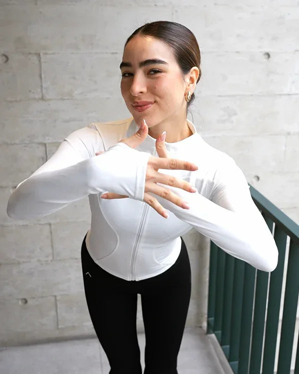 El cuello alto, el cierre frontal y los orificios para pulgar hacen de esta prenda una aliada práctica, cálida y funcional para tu rutina invernal.