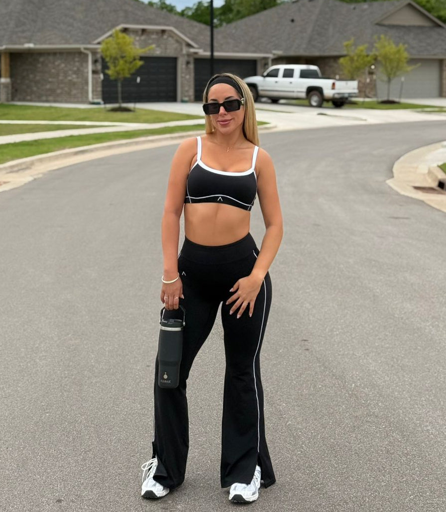 La prenda inferior tipo flare estiliza visualmente las piernas y permite un rango de movimiento completo, ideal para yoga, pilates, estiramientos o simplemente para llevar un look cómodo y alineado con tu energía.