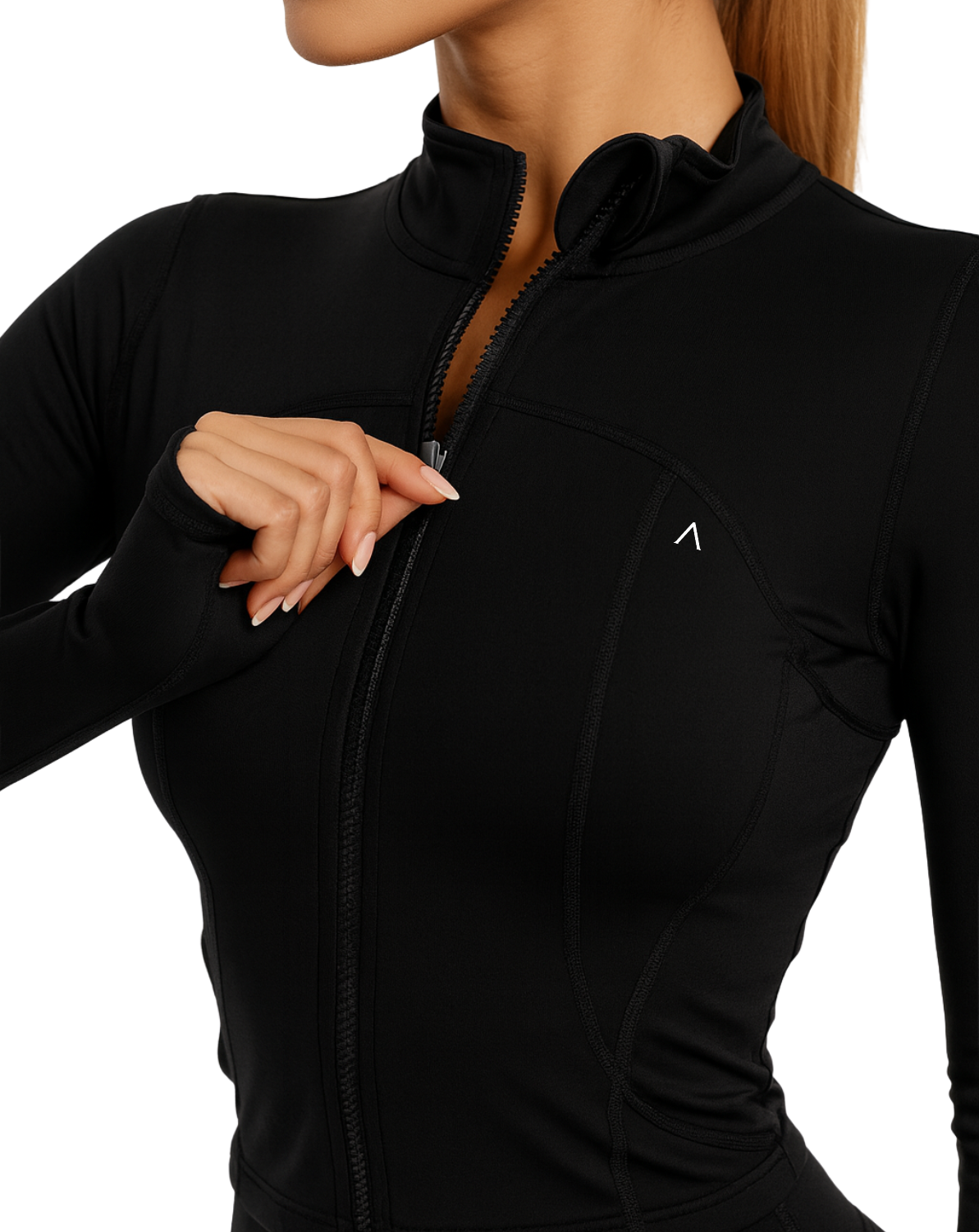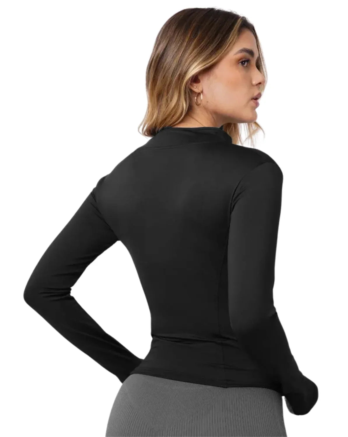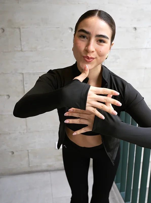 El cuello alto, el cierre frontal y los orificios para pulgar hacen de esta prenda una aliada práctica, cálida y funcional para tu rutina invernal.