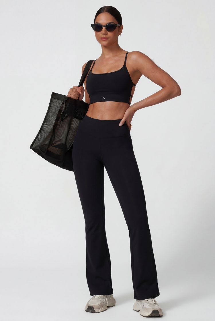 La legging flare de pretina cruzada abraza la cintura con soporte y suavidad, mientras su caída amplia estiliza y aporta una fluidez natural en cada paso. Ideal para yoga, pilates o simplemente relajarte con un look athleisure sofisticado.